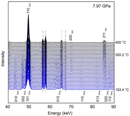 The sample was then cooled to room temperature under high pressure. Figure 2 shows a series of in situ synchrotron radiation powder X-ray diffraction patterns at 7.97 GPa. New Bragg peaks emerged at 320 °C. The peaks can be indexed to a hexagonal unit cell, indicating a phase transition from distorted bcc TaH to hcp TaH~2. The temperature at which the distorted bcc TaH Bragg peaks vanished was approximately 100 °C lower than the temperature at which hcp TaH~2 formed; distorted bcc TaH and hcp TaH~2 coexisted in the temperature region.
