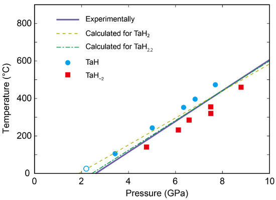 As illustrated by the solid line in Figure 3, the phase boundary was defined as the midpoints of dehydrogenation and hydrogenation p–T conditions. The phase transition temperature monotonously increased with increasing pressure, reaching 600 °C at 10 GPa. At 2.92 GPa, the phase boundary crosses the room temperature line at T = 27 °C. This is consistent with the previously reported transition pressure (2.2 GPa) from TaH2 to TaH at room temperature (open circle in Figure 3) [10].