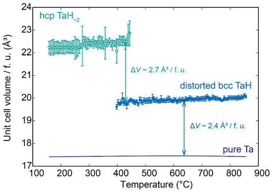 Figure 4 depicts the unit cell volume/f. u. of distorted bcc TaH and hcp TaH~2, obtained during a cooling run at a pressure range of 9.35 GPa to 8.36 GPa. Figure 4 also shows the unit cell volume/f. u. of pure Ta, which was determined by another in situ synchrotron radiation X-ray diffraction measurement. Temperature dependences of unit cell volume/f. u. of both distorted bcc TaH and hcp TaH~2 were within error bars in Figure 4, indicating that the hydrogen concentration of both distorted bcc TaH and hcp TaH~2 was constant at the observed p–T conditions. Using the value of hydrogen-induced volume expansion ΔVH = 2.4 Å3/f. u. [10], the averaged hydrogen concentration of distorted bcc TaH was estimated to be TaHx for x = 0.99 ± 0.04. The hydrogen concentration of hcp TaH~2 cannot be calculated in the same way, because unit cell volumes of hcp Ta are not accessible. The temperature dependence of the unit cell volume of hcp TaH~2, on the other hand, is within experimental error, indicating an almost constant hydrogen concentration of hcp TaH~2.
