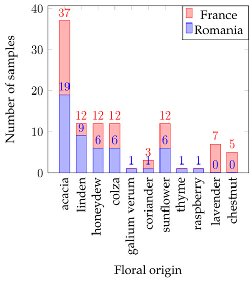 A total number of 103 samples, 50 Romanian and 53 French honeys were involved in the present study. The samples have different botanical origins (acacia, linden, honeydew, colza, galium verum, coriander, sunflower, thyme, raspberry, lavender, chestnut). The distributions of the honey samples in terms of floral and geographical origins are illustrated in Figure 1.