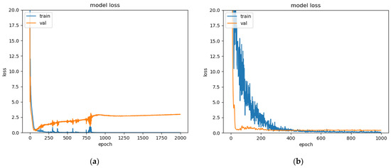 Avoiding over-fitting by including a dropout layer in the configuration of the Artificial Neural Network: (a) Without dropout layer; (b) With dropout layer. Both plots illustrate the variation of the training and validation sets’ loss along the epochs.