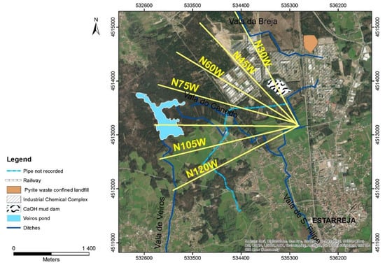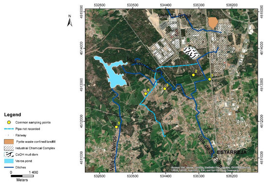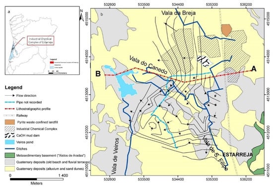 This industrial complex started operations in the 1950s and, since then, has gone through different production cycles. The more relevant products have been []: ammonium sulphate (1952–1990s) manufactured from sulphuric acid (obtained by pyrite roasting) and ammonia; nitric acid and ammonium nitrate (1974–1990s); nitric acid, aniline, and nitrobenzene (1978–present); sodium and chlorate compounds using mercury cathodes (1956–2002); polyvinyl chloride—PVC (1963–1983); and isocyanide polymers of aromatic base (1978–present). Consequently, large amounts of solid wastes, some enriched in metal(loid)s (e.g., As, Cu, Pb, Hg, and Zn) were produced, which were latter deposited in a sealed landfill, while others were deposited in a calcium hydroxide mud dam (Figure 1). In addition, effluents are also responsible for a high pollution load containing organic compounds (namely, aniline, benzene, monochlorobenzene, and mononitrobenzene) as well as metal(loid)s (e.g., As, Hg, Pb and Zn). Until 1975, these effluents were transported by artificial (open and permeable) ditches (Vala de S. Filipe, Vala da Breja, and Vala do Canedo), which discharged into the natural surface water streams []. In the present, they are transported by an emissary pipe to a water treatment plant and only then discharged into natural water systems.