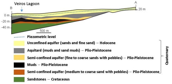 Simplified vertical profile (section AB marked in Figure 1) of the main units of the Quaternary aquifer system in the Estarreja region (adapted []). The vertical-to-horizontal scale ratio is 10:1.