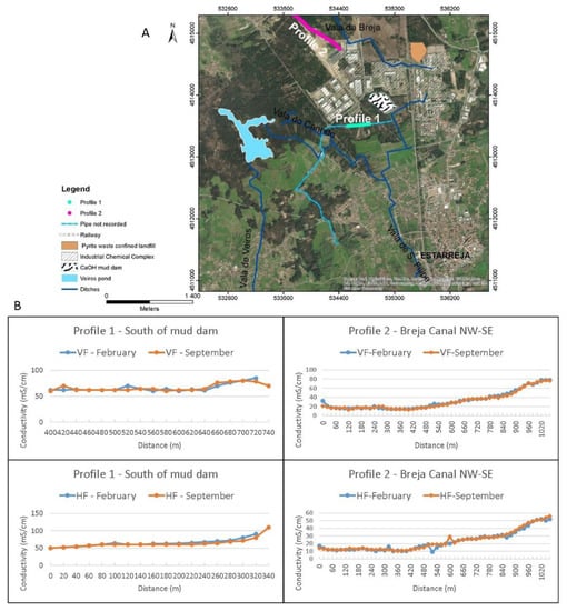 (A) Location of profiles 1 and 2 (map coordinates: UTM; WGS84—29N zone); (B) Seasonal variation of electrical conductivity in profiles 1 and 2 in the dry (September) and wet (February) season of 2016 (HF—horizontal fields; VF—vertical fields).
