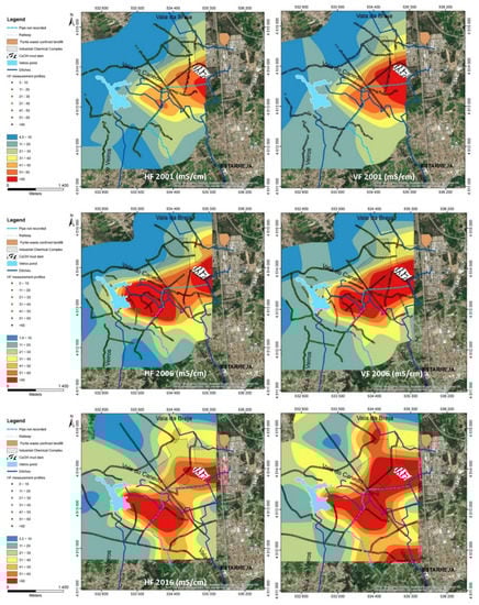 The differences in the hotspots for vertical coils (Figure 4; maps on the left) and horizontal coils (Figure 4; maps on the right), mostly refer to the intensity values. The horizontal fields showed lower conductivity values due to the greater relative representation that the non-saturated zone has at the depths reached by the vertical coils. Notwithstanding, both HF and VF maps showed that the unconfined and the semi-confined aquifers were impacted, which was particularly evident in the measurements for 2006 and 2016, and clearly revealed the extension and evolution of the contamination plume, providing a general qualitative image of the impacts near the ICCE. From 2006 onwards, data revealed remarkably high conductivity values just to the east of the Veiros pond, which were not observed in 2001, and thus must correspond to some event that subsequently occurred.