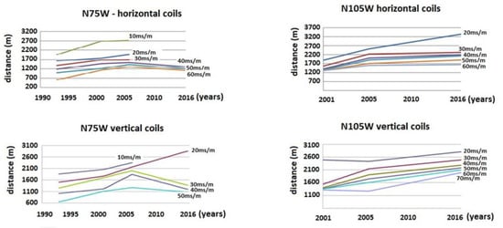 On the right of Figure 6, data from orientation N105° W are depicted. In this case, for both horizontal and vertical fields, contamination is shown to progress as distance increases in both graphs. However, there is a distinct change in the dip of the lines. This dip is gentler after 2006, revealing a lower propagation velocity of contamination, both for shallower and deeper areas. Therefore, remediation works also showed some degree of efficiency, although lower than that observed for N75° W.