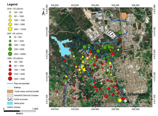 This suggests that contamination spreads by diffusion because of the main geological features hosting the aquifer system, namely, highly porous and permeable media. Nevertheless, significant changes in the EC values between nearby locations also occurred for measurements carried out in the 2007 and 2016 campaigns, which reinforces the combination of the local divergent radial flow (Figure 1) with local superficial contamination hotspots (Figure 7; A, B, and C sites). In addition, high EC values were also found to the south of the sampling area, particularly in 1989 and 2016, closer to the end portion of the industrial draining ditches (Figure 7, area D).