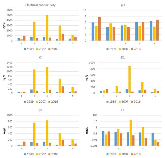In general, the first campaign (1989) showed the lowest mean electrical conductivity value (574 μS cm−1), as well as the lowest concentration of the analysed ions (Cl− 89.65 mg L−1; SO42− 82.53 mg L−1; and Na+ 56.0 mg L−1). However, for Fe the highest mean value (9922.6 μg L−1) was recorded in the 2007 campaign. For the 1989 and 2016 campaigns, the mean and median pH values were almost the same (Table 2).