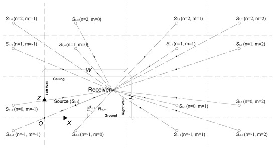 where n, m = 0, ±1, ±2, …, and Pn,m represents the sound field contribution from the (n, m)-th order image source, in which a positive n (or m) is for an image source located above the ceiling (or rightwards from the right wall) while a negative n (or m) is for that located below the floor (or leftwards from the left wall), as shown in Figure 1. Particularly, P0,0 denotes the direct sound from the real source S0,0. Based on the assumption of kW >> 1 and kH >> 1, Pn,m can be approximated from the plane wave expansion of a spherical wave as follows [14,15]: