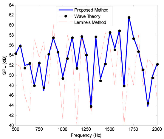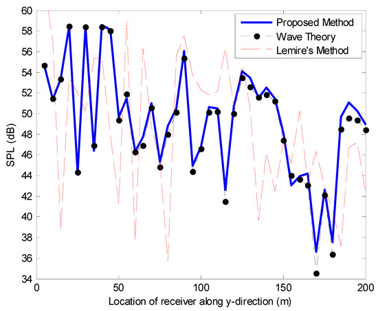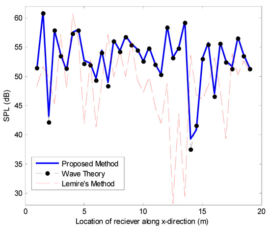 Comparison of predictions on sound pressure level (SPL) at a frequency of 1000 Hz vs. the receiver location along the x-direction. The source is located at (6 m, 0 m, 1 m) and the receiver is located at (xr, 50 m, 1 m) with xr moving from 1 m to 19 m. The solid line represents the results with the proposed method, the solid circles are those with the wave theory that is considered as a benchmark, and the dash line is the result with the method of Lemire and Nicolas (Lemire’s method).