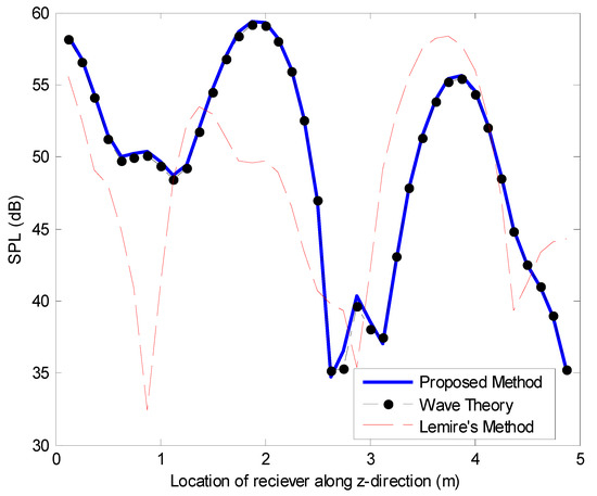 Figure 5 presents the SPL predictions at frequency of 1000 Hz versus the receiver location along the tunnel width direction. The source is located at (6 m, 0 m, 1 m) and the receiver is located at (xr, 50 m, 1 m) with xr moving from 1 m to 19 m. The results show excellent prediction agreement between the proposed model and the wave theory, even at receiver locations close to boundary interaction corners compared to the wavelength. In Figure 5, large discrepancies remain between the method of Lemire and Nicolas, and the reference method. Predictions are also compared on the SPL at 1000 Hz versus the receiver location along the tunnel height direction, with the source at (6 m, 0 m, 1 m) and the receiver at (6 m, 50 m, zr) with zr moving from 0.125 m to 4.875 m. The corresponding results are presented in Figure 6. It is shown that results from the proposed model almost overlap those from the wave theory, not only at receiver locations close to the reflective ground but also at those in the vicinity of the absorbent ceiling compared to the wavelength. Predictions with the method of Lemire and Nicolas still bias much from the benchmark results in this situation. The computational time in this simulation set is also recorded for comparison. In Matlab 2010b on the same computer as mentioned above, an evaluation of the proposed model and the method of Lemire and Nicolas takes about 1.8 s and 1.7 s for results at each receiver location in Figure 4 to Figure 6, respectively, while the corresponding calculation with the wave theory takes over 80 s. These show that the proposed coherent image source model can accurately predict the sound fields in long rectangular spaces with an absorbent ceiling, while its computational load stays at a same level with the existing models [3,9,12,13].