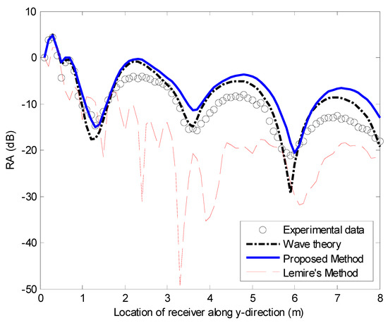 Predictions from the proposed method and the method of Lemire and Nicolas were compared with the experimental data, as presented in Figure 7 as well. It is shown that, although the assumption of kW >> 1 and kH >> 1 can be hardly satisfied in this case with a wavelength of 0.344 m, the predictions from the proposed method can still have reasonable agreement with the benchmark results, which indicates that such a requirement may be relaxed in applying the proposed method. In this case, the method of Lemire and Nicolas can predict reasonably well at the receiver in the vicinity of the source, however deviating far from the benchmarks when source/receiver distance being large compared to the wavelength. These comparison results in the experimental case provide further validations on the proposed method.