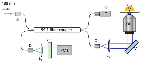 Garai et al. also developed an FCS system based on fiber optics [11]. A single-mode optical fiber with a mode field diameter of 3.3 μm was used as a probe. The system was expected to be applied to remote measurements of fluid flow, particle size, or viscosity. They successfully demonstrated the system can apply to the measurement of fluorescence beads with a diameter of 13 nm. In the system, a dichroic mirror was used to eliminate scattered lasers. For this reason, an adjustment for excitation laser coupling to the single-mode optical fiber after the dichroic mirror was needed.