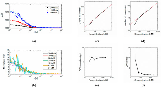 Figure 2c shows the linear relationship between the fluorescence count rate and the concentration. The red broken line is a regression line for concentrations ranging from 63 nM to 2000 nM (, ). At low concentrations, the count rate was too low compared to the value predicted by the linear fitting line. This was likely due to the background correction error because of the long-term (time scale of several ten minutes) fluctuations in the laser power.