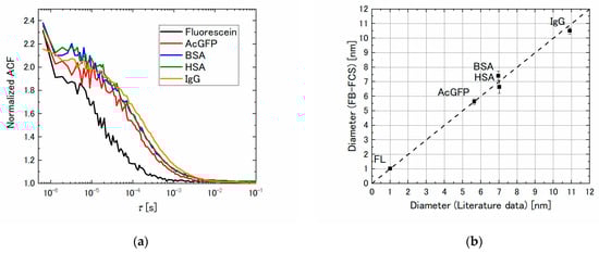 FB-FCS measurements on fluorescently labeled proteins. (a) Normalized ACFs. (b) Comparison between diameters measured by FB-FCS and results from the literature. The dashed line shows the y = x line. The error bar represents the standard error (n = 5–8). FL denotes the data point of fluorescein.