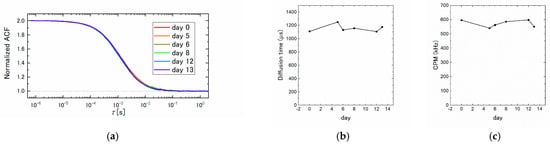 To validate the robustness of the FB-FCS system, the same sample was measured on different days for two weeks without any mechanical adjustment, as shown in Figure 4. The sample consisted of green fluorescent beads with a diameter of 0.04 μm (Polystyrene Fluorescent Microspheres, Dragon Green, FSDG001, Cosmo Bio, Tokyo, Japan). The beads were diluted to a concentration of 0.41 μM using pure water. The 10-s measurement was repeated 15 times, and the averaged ACF was analyzed each day. There was almost no difference in the shape of the normalized ACFs for two weeks, as shown in Figure 4a. In addition, neither the diffusion time nor the CPM showed a large difference, as shown in Figure 4b,c. The mean diffusion time in a day was 1154.1 ± 54.3 ms (mean ± standard deviation), and its coefficient of variation was 4.7%. The mean CPM in the days was 572.4 ± 24.5 kHz (mean ± standard deviation), and its coefficient of variation was 4.3%. These results indicate that reliable and reproducible FCS data can be obtained without any adjustment of the developed system.