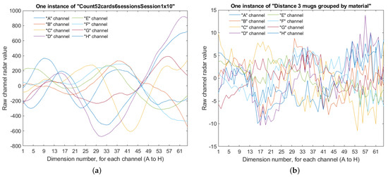 Figure 1a,b shows the eight 64D signals obtained by the radar sensor for two instances, each from a different dataset. We can see the complex and irregular shape of the signals detected by the sensor.