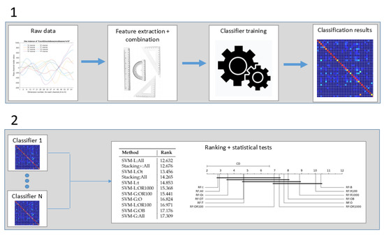 Figure 3 shows a flow diagram of the general data processing strategy followed in the paper. The figure shows the processing chain divided into two parts. The first of them shows that different types of features and feature combination strategies are obtained from the raw data values, and different classifiers are trained and used to obtain the classification accuracy results for the different datasets. In the second part, these classification accuracy results, for each dataset, are ranked, and the statistical significance of their differences are obtained in order to assess which method is better, and whether the differences among classification strategies are statistically significant or not.