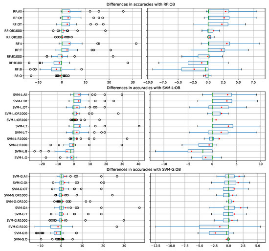 Boxplots of the differences in accuracy between the different feature sets and the feature set (OB), for the three considered classifiers. The boxplots on the right do not include the outliers. The average differences are marked with a red dot (•).