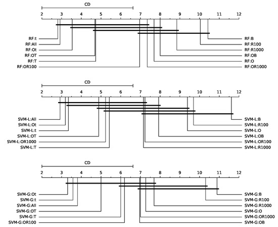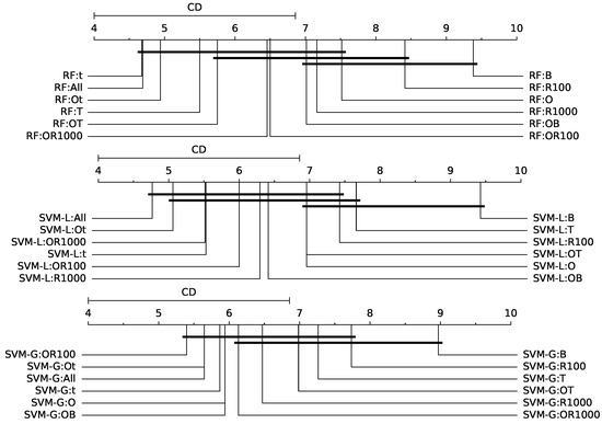 Given the large number of (Classifier:Feature Set) tested methods, it is preferable to obtain the average ranks by considering smaller pair groups. Therefore, methods were divided depending on the type of classifier used: RF, SVM-L, and SVM-G. These average ranks are shown in Table 6.