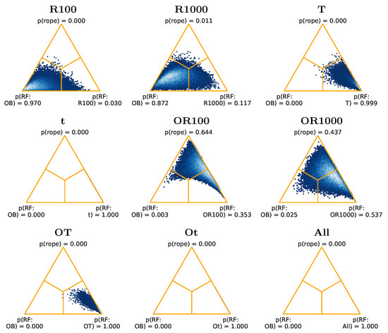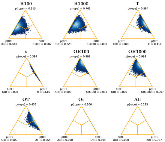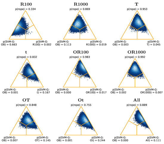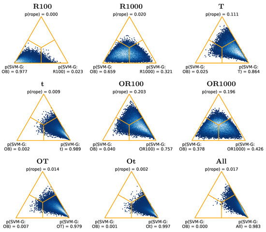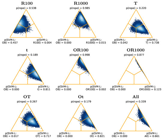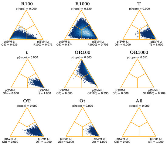Figure 6, Figure 7 and Figure 8 show the Bayesian Signed-Rank Tests posteriors, for the RF, SVM-L, and SVM-G classifiers, respectively. In these figures, the (OB) feature set is compared against each one of the other feature sets, for the corresponding classifier. For each feature set, there is a triangle. In these triangles [43], the bottom-left and bottom-right regions correspond to the case where one method is better than the other or vice versa. The top region represents the case where the ROPE is more probable. The corner triangles show the probability of each region. The left region in the triangle is for OB and the right region for the other feature set.