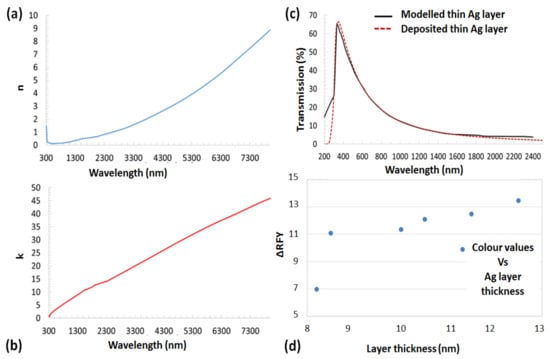 Extrapolated digitized optical constants dispersion data (a,b), and the optical (c) [32], and color (d) characterization results for thin sputtered Ag layers. The color values (measured using Minolta 508D) for different Ag thicknesses show the variation in ΔRFY versus Ag layer thickness, which reflects the importance of characterization for optimum film development.