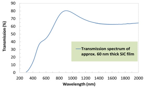 Amorphous SiC films were chosen because of their comparatively low growing temperature, which ensures greater compatibility with silicon-based technologies. However, in order to maximize the growing circumstances, high-quality films must be obtained [33]. We sputtered SiC thin films from a ceramic-type solid SiC sputtering target using the RF magnetron sputtering technique. The transmission spectrum of sputtered SiC film (as shown in Figure 3) confirms the semitransparent properties that can be varied depending on the film thickness.