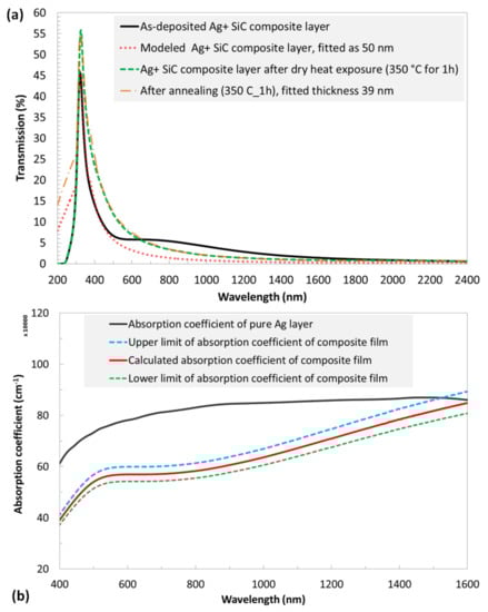 A small hump on the spectral response of the as-deposited composite layer was observed in comparison to that of the modeled layer; however, significant spectral shifts were observed in all of the high-temperature (above 300 °C) heat-treated films. The modeling of the nanocomposite layer transmission involved using a weighted average of the dielectric permittivities of the material components, using OptiLayer software. All of the heat-treated samples showed comparatively smoother transmission spectra, which might imply that the additional SiC compound transforms from the amorphous phase to the quasi-crystal stage, and this helps protect the pure-silver content from agglomeration or turning into nanoparticles. From the measured transmission spectrum of the as-deposited composite layer, we numerically evaluated the possible range of the absorption coefficient of the composite film, across a wide spectrum. Figure 4b shows the obtained wavelength-dependent absorption coefficient plotted within its possible upper and lower limits, compared to that of a pure silver layer. The upper and lower limits were evaluated by considering the maximum ±5% thickness error.