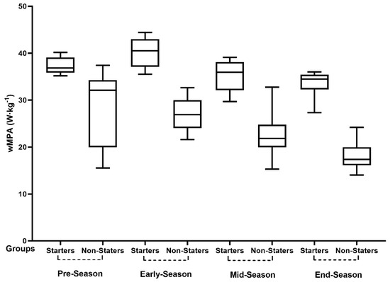 Regarding wMPA, starters and non-starters revealed significant variations through the season. Specifically, starters showed higher values in early-season > pre-season > mid-season > end-season, while non-starters presented higher values in pre-season > early-season > mid-season > end-season. The presented results showed a different pattern to those found by Nobari et al.’s [16] study, where starters and non-starters showed significantly higher values in pre-season over early-season for MPA training monotony and strain indexes. Meanwhile, the same study observed a tendency to decrease MPA training monotony and strain indexes from the beginning to the end of the season, which is in line with the present study. Although the present study did not analyze training monotony and training strain, it seems there is a similar tendency of higher values in the pre-season and early-season, which means higher external workloads at the beginning of the season that are reduced until the end of the season.
