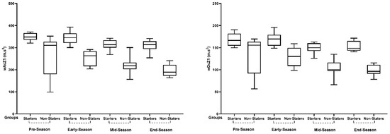 In wAcZ2 and wDcZ2, starters presented the highest values in pre-season and early-season, and the lowest values in mid- and end-season, without significant variations. However, non-starters showed some variations for the same variables, where higher values were found in early-season.