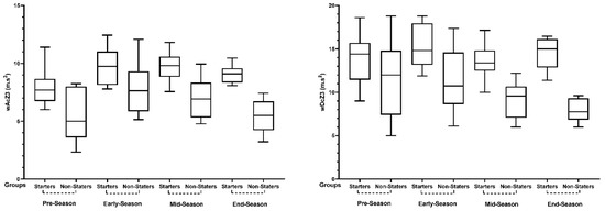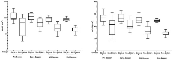 Finally, in wAcZ3, starters presented lower values in pre-season and higher values in early- and mid-season. Regarding wDcZ3, the pattern showed a w-shape variation without significant differences. However, in wAcZ3, non-starters showed some variations and higher values in early- to mid-season, but in wDcZ3, they showed higher values in pre-season and early-season, and the lower values were not found until the end of the season. Indeed, and according to the previous study, starters presented significantly higher values for all accelerometer-based variables than non-starters (all p < 0.05), except for wDcZ3 during pre-season, where no significant differences were found (p > 0.05) [21].