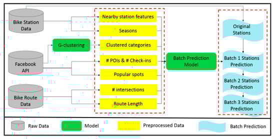 Data preprocessing. We first collect government open data and fetch others from Facebook Place API. We also record the latitude and the longitude of all bike stations. Next, we extract spatial features for each station, including nearby station features, seasons, number of POIs and number of check-ins, popular spots, number of intersections, and the length of bike routes based on the parameter r of the reachable station region. Finally, the proposed G-clustering algorithm is applied to cluster categories, and all of the extracted features are prepared to be fed into prediction models. Numerical data normalization, data cleaning, and missing data imputation are also applied to all features.