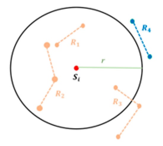 Reachable Station Region. Considering how far a resident is willing to move and to get appropriate modeling of spatial factors, we define r as the radius of the farthest influencing area of a new station. In other words, when considering a location to build a new bike station, we propose to set a Euclidean distance r to extract the neighbor characteristics and features. Figure 2 gives an example. Si is the target location, and we extract the density of our pre-defined POIs, which may be correlated with bike demands within the region.