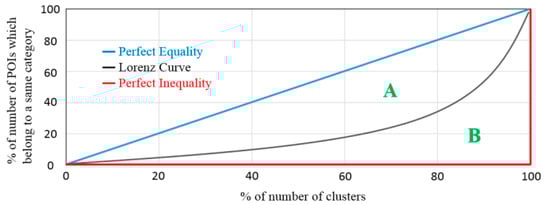 Since thousands of corresponding categories for POIs exist in certain regions, it is impractical to perform a one-to-one clustering for mapping a single category to a class. Therefore, we propose G-clustering to allocate categories into classes, where the characteristics of each category are similar to those of all the other categories in the same class. The G-clustering is inspired by the Gini coefficient [14], which is an index proposed by Corrado Gini to judge the fairness of annual income distribution according to the Lorenz curve. In order to apply the concept of the Lorenz Curve in our work, we modify the definition of it, which is illustrated in Figure 4. The Gini coefficient is equal to the area ratio between A and (A + B), and it is also equal to 2A since the sum area of A and B is 0.5.