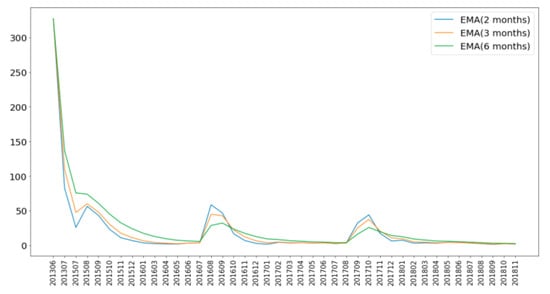 Batches Prediction. Our work focuses on batch prediction; in other words, site prediction established in later stages in the suburbs or border zones, which are also defined as expansion areas in this paper. We propose to utilize EMA (Exponential Moving Average) to determine the periods of batches given a continuous time interval. The EMA is a type of average that applies weighting factors that decrease exponentially to the past. We define a batch that exists if the EMA values of month demands are continuously not less than a given threshold for several months. Figure 5 shows the EMA distribution that we perform using 2, 3, and 6 months as the average units. For example, if we define the threshold as 30 using the two months average of EMA for New York City, we can then identify three batches(peaks) from 2013 to 2018. The corresponding periods of the first, second and third batches of NYC are shown in Table 4. Our framework provides the government the estimation of the demands of newly established stations through given locations, and this can also be applied to the expansion of other facilities.