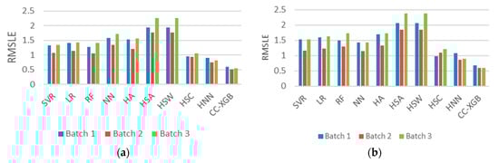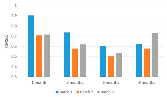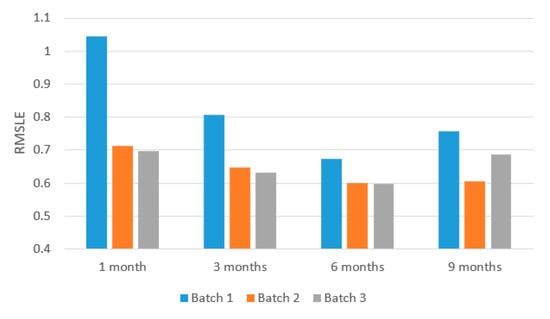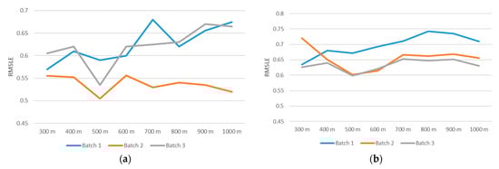 In our experiment, the reachable station region is set as 500 m (Figure 1 (left)) for the appropriate number of POIs and check-ins. In this part, we would like to compare how different radiuses affect the results. Features I, III, and V are related to the reachable station number. Experiments are conducted from 300 m to 1000 m in Figure 8. As shown in Figure 8, a larger radius does not necessarily mean a better prediction result. We can observe that in Figure 8, 500 m is a superior radius region for a target station to extract corresponding features since the RMSLE for three batches are relatively low when r = 500 m.