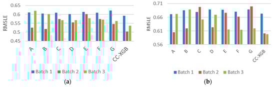 Results of Feature Combination: Figure 7a,b represent the results of the different combinations of features in rental and drop-off, respectively. The result of feature set E without features of category clustering in Figure 7b has poor performance evidently, confirming that G-clustering is effective. No one always performs better between IV-D and IV-K; one reason may be due to slight differences in clustering results. Though the differences in the batches are not obvious, CC-XGB performs much better than other feature sets in batch 2 and 3, confirming the applicability of our framework.