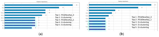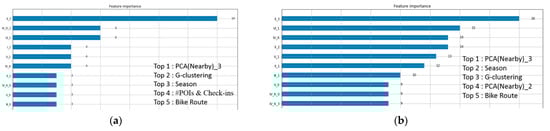 Figure 9, Figure 10 and Figure 11 show the feature importance for Batch 1 to Batch 3, and the detailed features whose importance is ranked in the top five are listed aside. Figure 9a, Figure 10a, and Figure 11a show rental feature importance, while Figure 9b, Figure 10b, and Figure 11b show drop-off feature importance. Overall, the nearby station features are extremely important in prediction since they have the highest scores in all situations; in particular, the score gap is more significant in Batch 3 (Figure 11a,b), explaining that nearby stations are highly correlated to newly established stations. The feature importance obtained from G-clustering is all ranked in the top five in those five figures (top-6 in Figure 11a), proving that our idea of clustering categories is reasonable and useful.