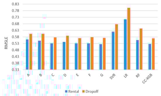 Similar to works focusing on predicting demand through splitting data into the training set and testing set without considering established time, we also repeat the same steps in our experiment to verify the usefulness of our LDA framework. In other words, we conduct the prediction experiment of rental/drop-off demand 10,000 times through randomly divided stations and return the average RMSLE result (Figure 14). The result of CC-XGB still performs the best. However, our superiority is not so apparent since our proposed features are relatively suitable for batch prediction rather than random prediction.
