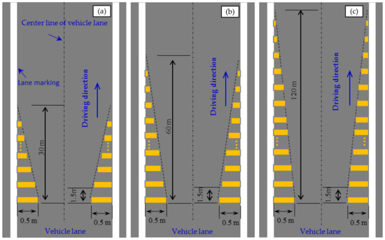 - Shi, X.H.; Zhi-Gang, D.U.; Zheng, Z.J.; Chao-Zhong, W.U.; Transportation, S.O. Optimization of Optical Illusion Deceleration Markings in Middle of Highway Tunnel. J. Highw. Transp. Res. Dev. 2016, 33, 89–96. [Google Scholar]