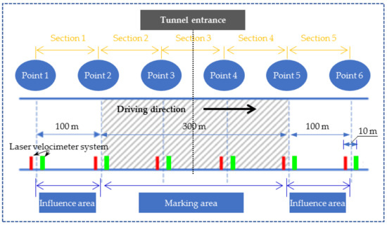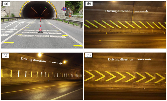 - Wan, H.; Du, Z.; Yan, Q. The speed control effect of highway tunnel sidewall markings based on color and temporal frequency. J. Adv. Transp. 2016, 50, 1352–1365. [Google Scholar] [CrossRef]