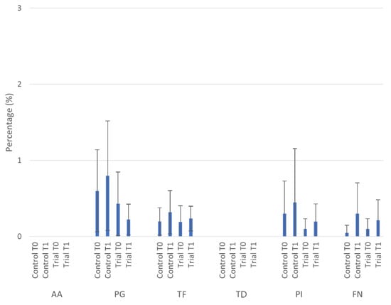 | Aggregatibacter actinomycetemcomitans | Control T0 | 0.00 | 0.00 | 0.00 | 0.00 | 0.00 | p > 0.05 |