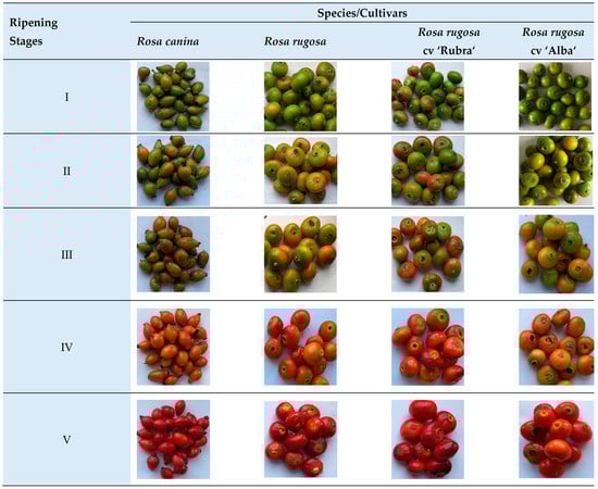 A two-factor experiment: Factor A—two rosehip species and two cultivars: Rosa rugosa (pink flowers, fruits red, spherical (tomato-shaped hips), about 2.5–3 cm in diameter), Rosa canina (pale pink flowers, fruits red-orange, oval, about 1.5–2 cm in diameter) and Rosa rugosa cv ‘Rubra’ (violet—purplish flowers, fruits red, spherical (tomato-shaped hips), about 2.5–3 cm in diameter), Rosa rugosa cv ‘Alba’ (pure white flowers, fruits orange-red, spherical (tomato-shaped hips) about 2.5–3 cm in diameter). The selected species/cultivars grow best in the climatic conditions of the Lithuania. Factor B—ripening stage (Figure 1):