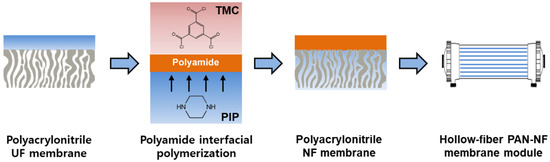Figure 1 presents the fabrication protocol of the HF polyacrylionitrile (PAN) NF membrane (Synopex, Pohang, South Korea). First, the pristine PAN-UF support was impregnated with an amide aqueous solution for 10 min, and the excess amide solution was removed using a rubber roller (Sigma Aldrich, St. Louis, MO, USA). The amide aqueous solution was made by dissolving 1–4% w/v piperazine (PIP, Sigma Aldrich, St. Louis, MO, USA), 0.5–2% w/v triethylamine (Sigma Aldrich, St. Louis, MO, USA), and 0.5–2% w/v polyvinyl alcohol (Sigma Aldrich, St. Louis, MO, USA) in deionized (DI) water. Subsequently, a trimesoyl chloride (TMC 0.05–0.4% w/v, Sigma Aldrich, St. Louis, MO, USA) solution in toluene (Sigma Aldrich, St. Louis, MO, USA) was poured on the PIP-saturated PAN support and allowed to react for 3 min to form a polyamide (PA) selective layer. The prepared PAN-NF membrane was then rinsed with pure toluene to remove unreacted TMC, and then dried at 70 °C for 3 min. Subsequently, the PAN-NF HF was modulated with a stainless steel pipe. After full curing (3 h), the single PAN-NF HF module was stored in distilled water until utilization. The module characteristics, operating conditions and SEM morphologies of the PAN-NF HF membrane are listed in Table S1 and Figure S1.