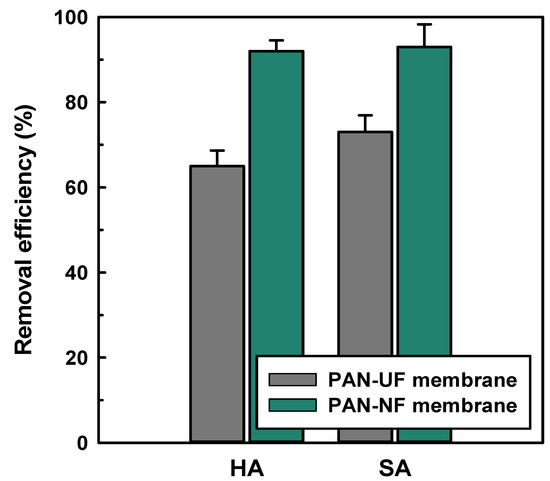 Removal of natural organic matter (NOM) (humic acid, HA, and sodium alginate, SA) by pristine and modified PAN-NF HF membranes. Operating conditions: HA and SA = 5 mg/L; pressure = 5 bar; stirring speed = 300 rpm; cross-flow velocity = 1 L/min; conductivity = 300 μs/cm; and temperature = 25 °C.