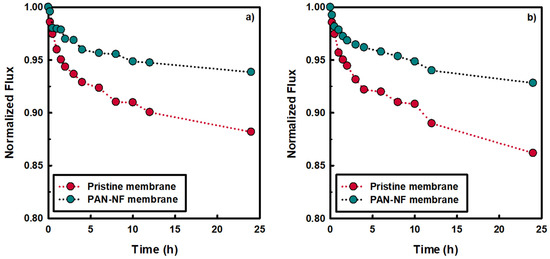 Normalized permeate flux as a function of time for modified and pristine PAN-NF membranes as a function of time. Operating conditions: (a) HA and (b) SA = 5 mg/L; pressure = 5 bar; stirring speed = 300 rpm; cross-flow velocity = 1 L/min; conductivity = 300 μs/cm; temperature = 25 °C. The permeate and concentrate were recirculated back to the feed tank during filtration.