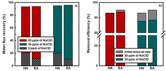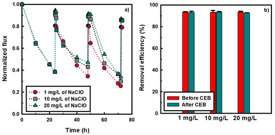 where Rv is the relative permeability recovery; Pac is the permeability after cleaning; Pbc is the permeability before cleaning; and Pv is the initial permeability of the virgin membrane (LMH/bar) [24]. NaClO is known to be an efficient chemical cleaning agent [22,23,24,25,26]. Therefore, low concentrations of NaClO at 1–10 mg/L were used to ensure minimal negative impact on the membrane and to optimize the conditions for water treatment.