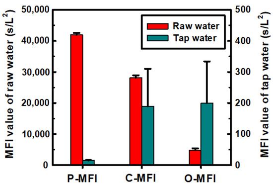 A newly developed modified fouling index (MFI) approach using a multiple membrane array system was applied to evaluate the fouling potential of RO feed water described in our previous reports [27,28,29,30]. In this method, feed water (i.e., raw water from Indonesia) was first filtered by a microfiltration (MF) membrane to determine the fouling potential of particulate matter larger than 0.45 µm. The permeate obtained from the first MF membrane (0.45 µm, Millipore Corp., Burlington, MA, USA) was then fed to the next ultrafiltration (UF) membrane (100 kDa, Millipore Corp., Burlington, MA, USA) to assess the fouling potential of nanocolloids. Finally, feed water containing mainly organic foulants was introduced into another tight UF membrane (10 kDa, Millipore Corp., Burlington, MA, USA) with a surface area of 0.00138 m2. In this method, feed water was first filtered by a MF membrane to determine the fouling potential of particulate matter larger than 0.45 µm, named as particle-MFI (P-MFI). The permeate obtained from the first MF membrane was then fed to the next UF membrane named by colloid-MFI (C-MFI), which assessed the fouling potential of nano-colloids. Finally, feed water containing mainly organic foulants was introduced to the tight UF membrane by organic-MFI (O-MFI) [28,31].