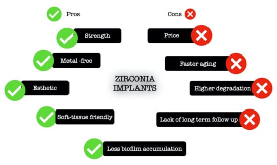 Likewise, the implants made of titanium, the zirconia implants, also undergo a surface modification to improve their biological responses. The most common are sandblasting, acid etching, selective infiltration technique (coating the surface with glass infiltration and then heating it in temperature higher than glass transition temperature followed by the infiltration of molten glass between the material grains), polishing, laser treatment, and ultraviolet light [13]. Figure 1 presents the advantages and disadvantages of zirconia implants.