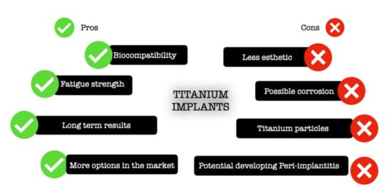Titanium is the ninth most common material found in nature [24]. The most common oxide is titanium dioxide (TiO2), which can be seen as a natural mineral source in three different crystalline forms called anatase, brookite, and rutile [24,25,26]. This material undergoes an allotropic transformation and changes from one crystallographic form to another. At room temperature, it has a hexagonal close-packed structure called the α phase. However, at high temperatures, or precisely at 883 °C, it changes to the β phase where it has a body-centered cubic structure [24,27]. Moreover, titanium can be combined with various other elements to increase its strength and provide resistance against corrosion [25]. Thanks to titanium biocompatibility, this material is broadly used in medicine and dentistry. Overall, titanium is considered inert and safe for human use with minimal side effects in the human body. Figure 2 presents the advantages and disadvantages of titanium implants.